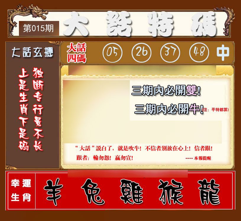 015期六肖中特【牛鸡羊猴鼠虎】开:?00 |